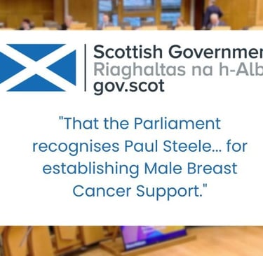 Following our recent press release, a motion was lodged in Holyrood titled "Glasgow Man Championing Male Breast Cancer Support." To see my name and the work of Male Breast Cancer Support recognised in a formal parliamentary motion is something I never could have imagined when I first started this. Even more heartening is the cross-party support the motion has received, with MSPs from across the political spectrum signing on to acknowledge the vital need for male-specific cancer support in Scotland.